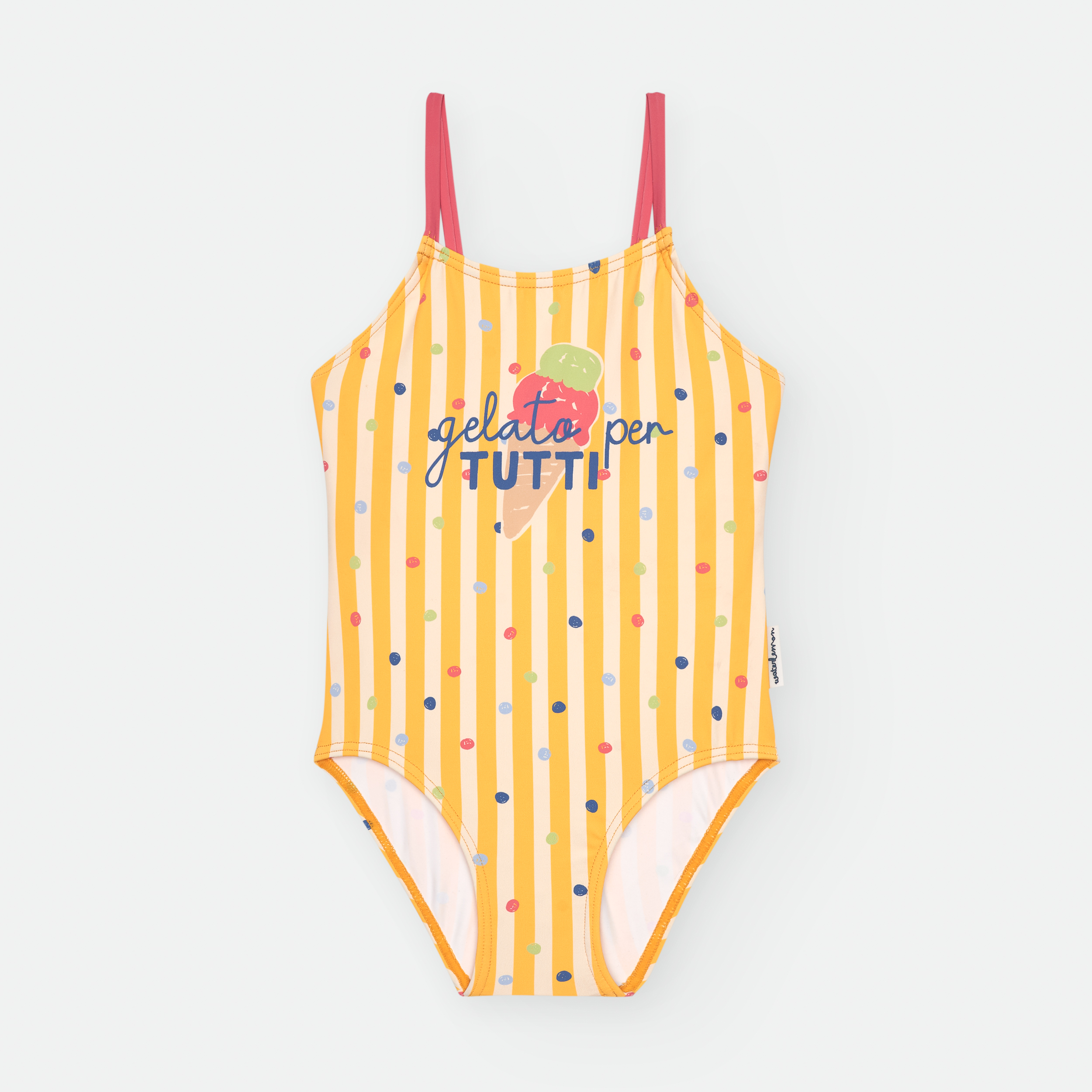 Bañador escote recto y tirantes finos con lazo en el centro de la espalda. Estampado de rayas y topos con fondo color crudo y estampado posicional de helado. Tallas de 6 meses a 12 años.