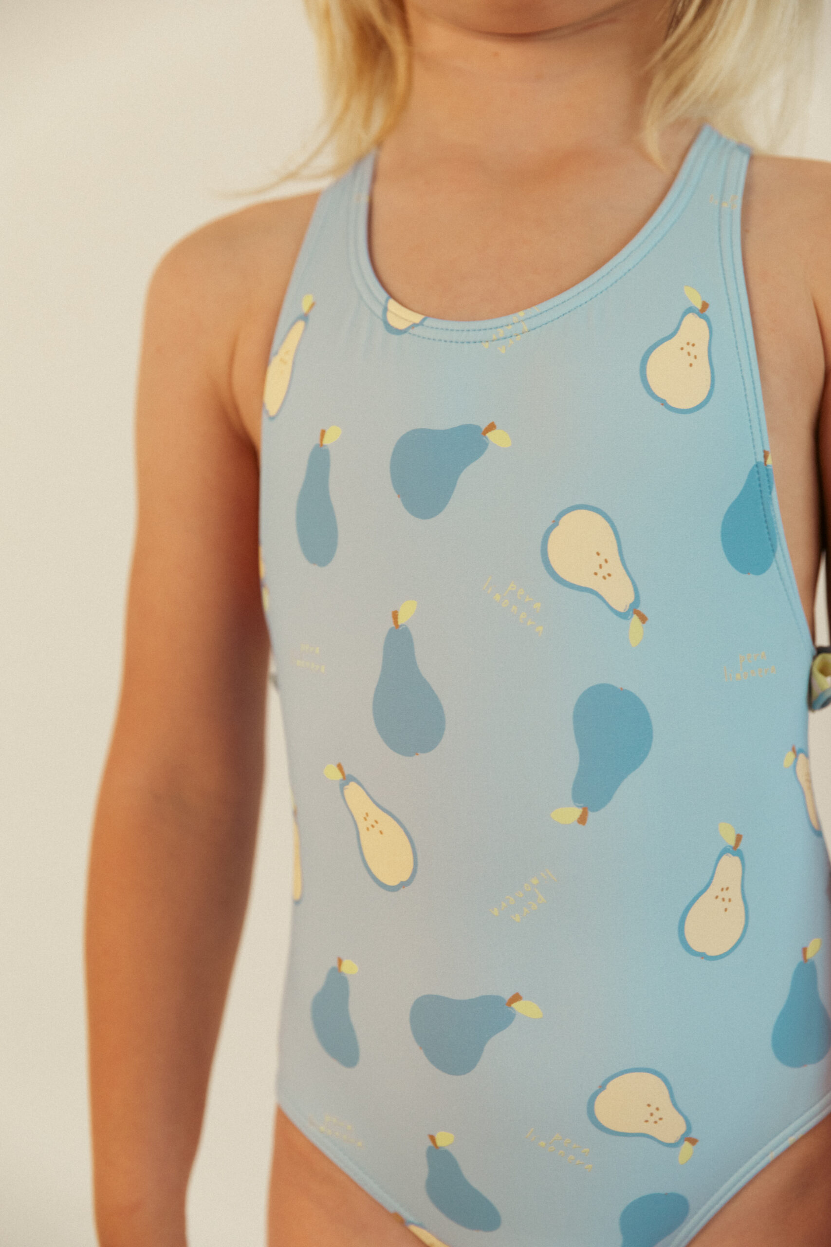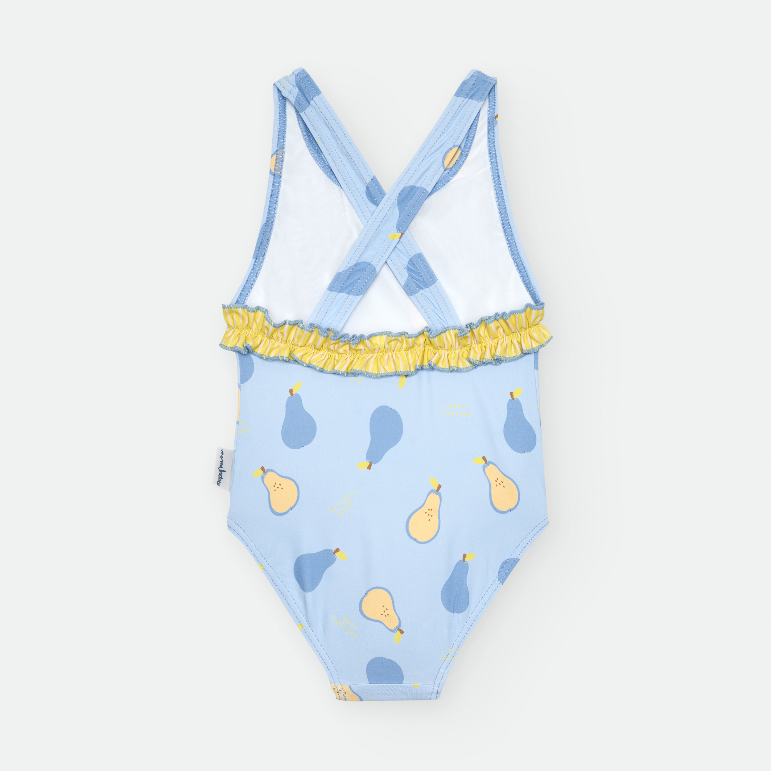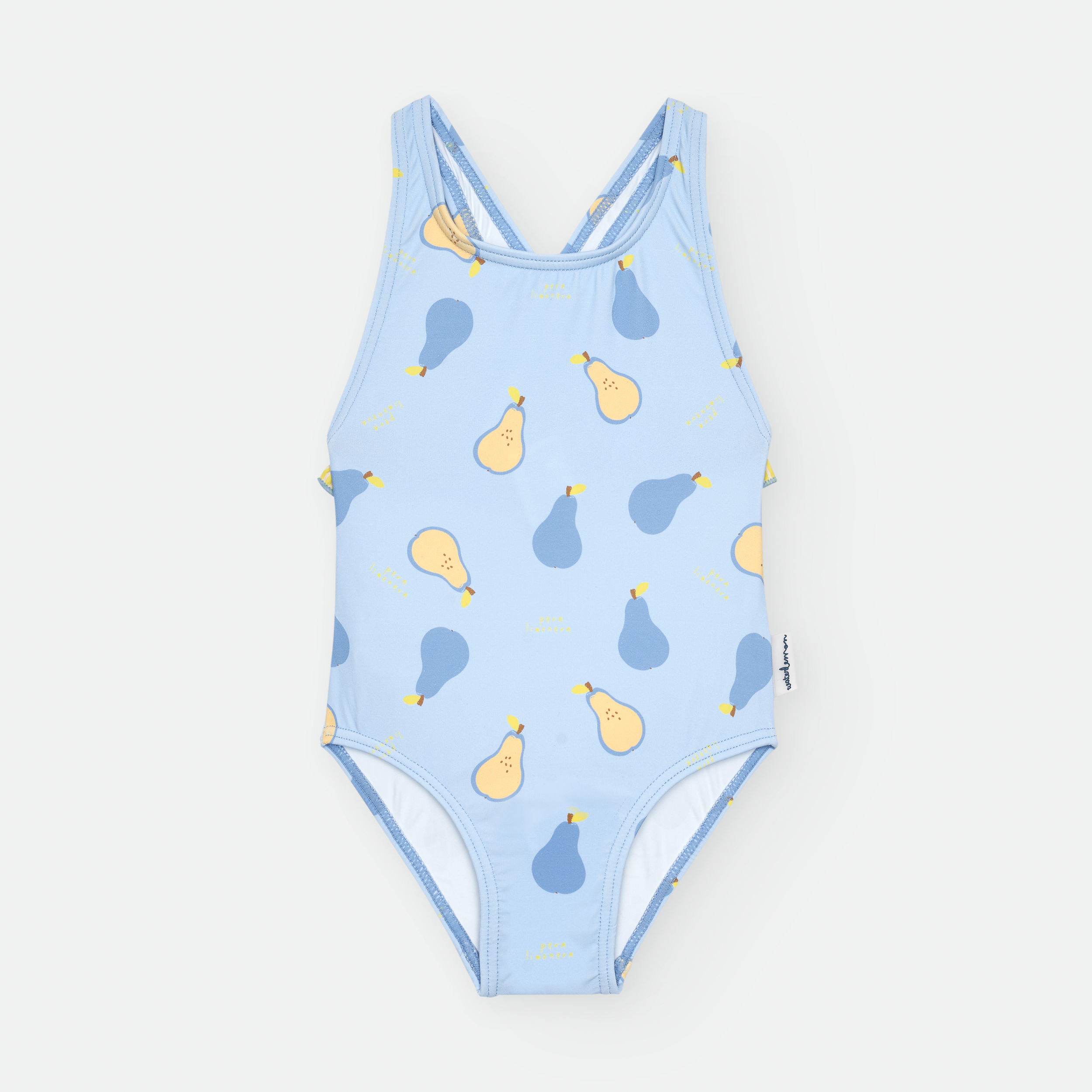 Bañador escote redondo, tirantes cruzados en la espalda y volante en el trasero. Estampado de peras con fondo color azul claro. Tallas 6 a 16 años.