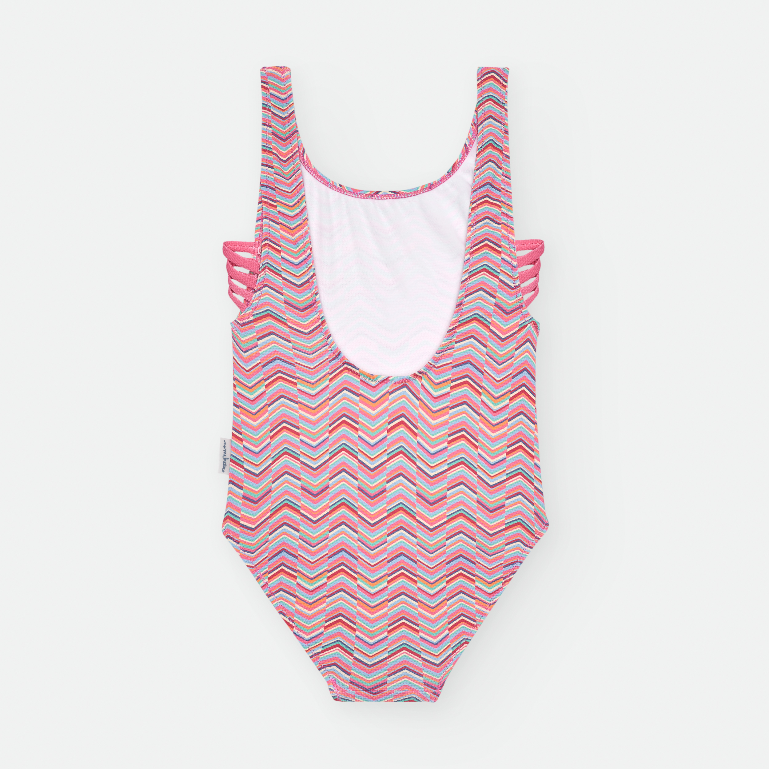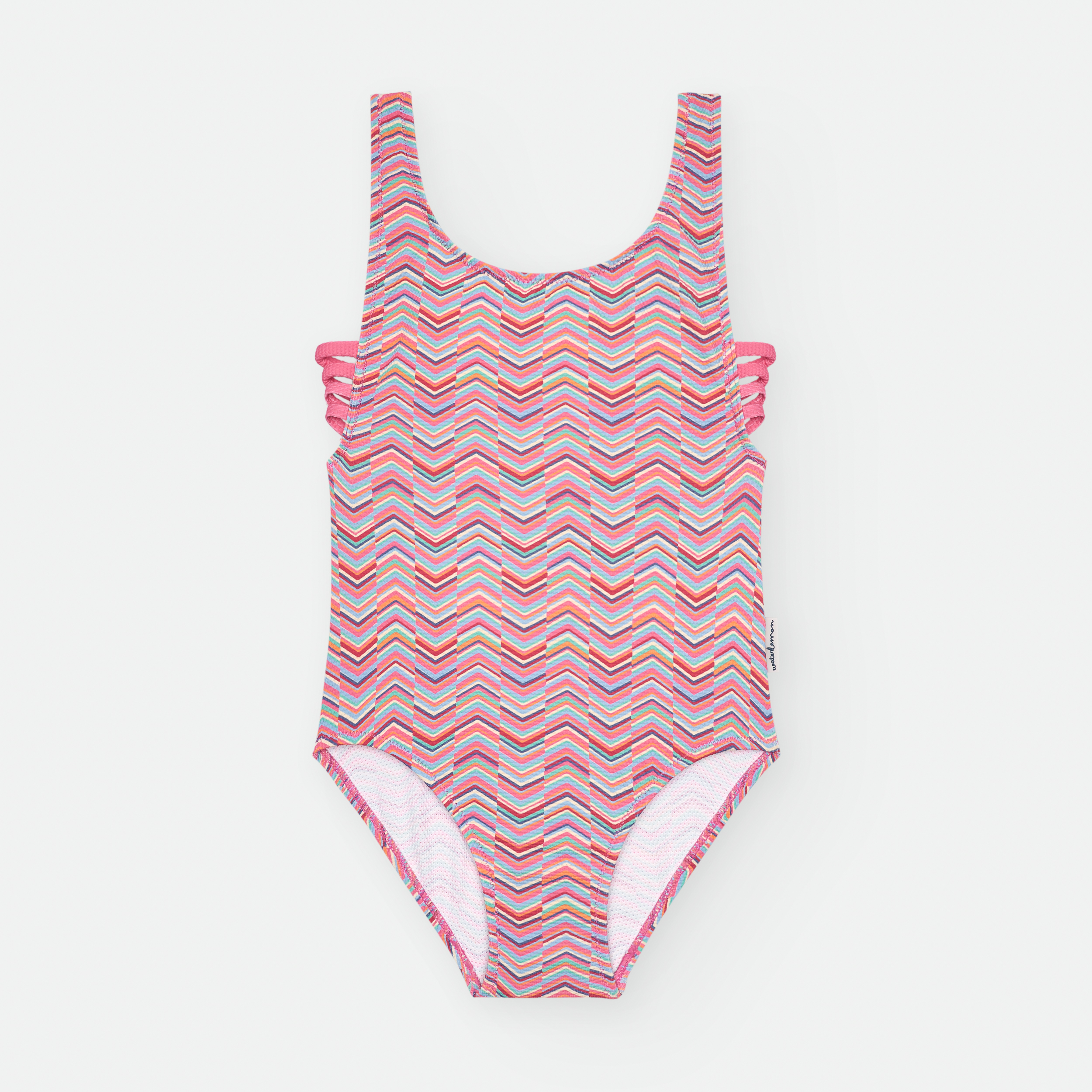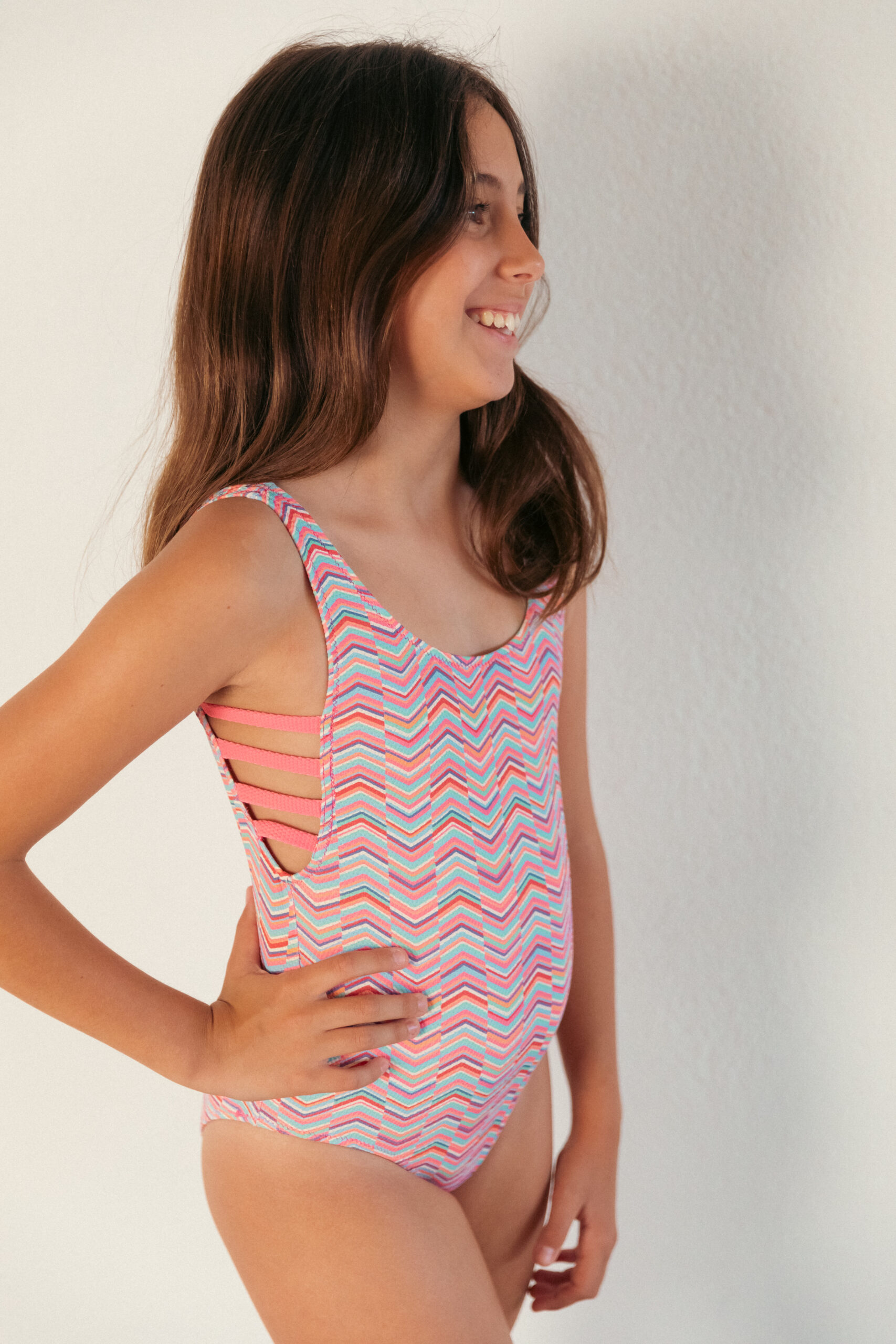 Bañador escote redondo y tiras en los laterales. Tejido de estructura piqué con estampado étnico en fondo color crudo. Tallas 6 a 16 años.
